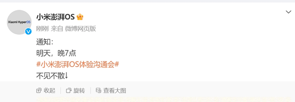 【手机中国新闻】12月6日,手机中国注意到,小米澎湃OS官方官宣将于明晚七点直播举行“小米澎湃OS体验沟通会”。官方称,大家也可以理解为,这就是小米澎湃OS发布会的下篇。这一次,小米澎湃OS体验设计的海量细节和思考,我们一起展开聊聊。