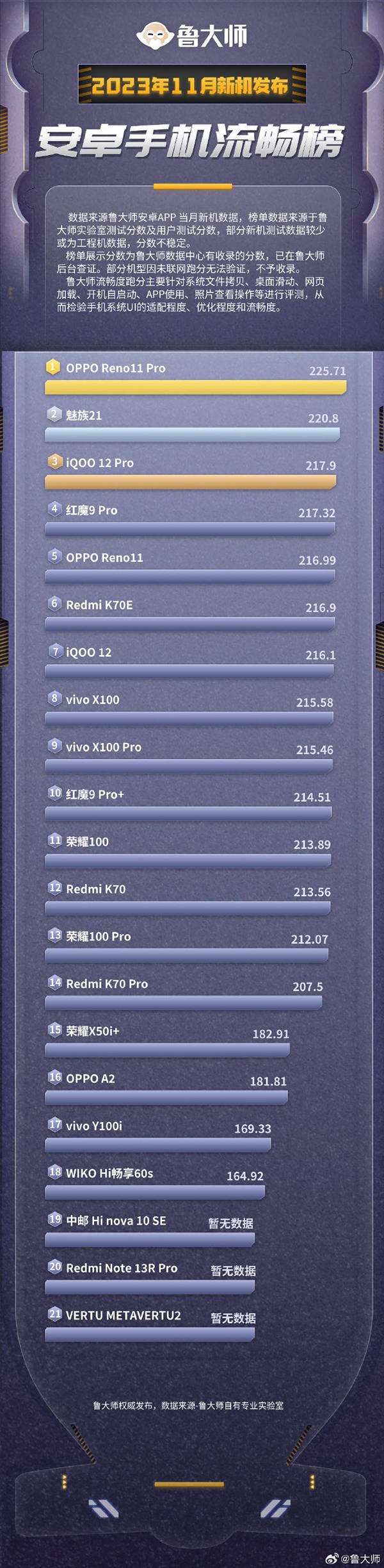 随着最新一期的《鲁大师久用流畅测试报告》出炉,榜单数据来源鲁大师安卓APP当月新机数据,榜单数据来源于鲁大师实验室测试分数及用户测试分数。