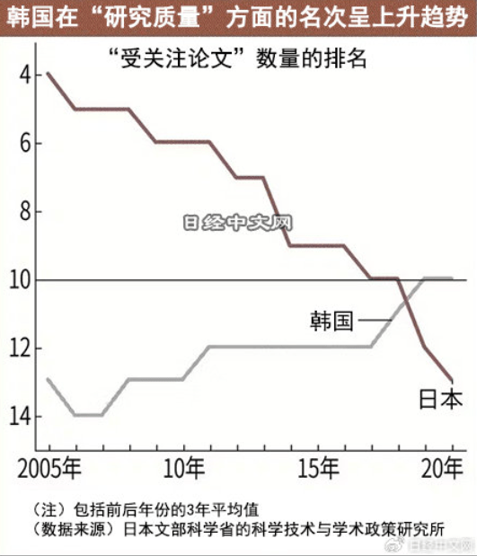 日媒称,韩国的“受关注论文”数量(即被其他论文引用的次数排在前10%的论文)排名也不断提高。从日本文部科学省的科学技术与学术政策研究所的统计数据来看,2000年时,韩国排名第14位,之后截至2017年一直排在第12-14位,2019年跃居第10位并超过日本,最近的2020年也维持这一排名。
