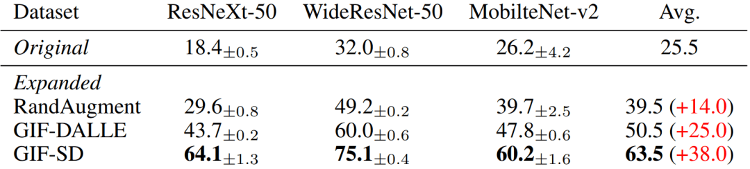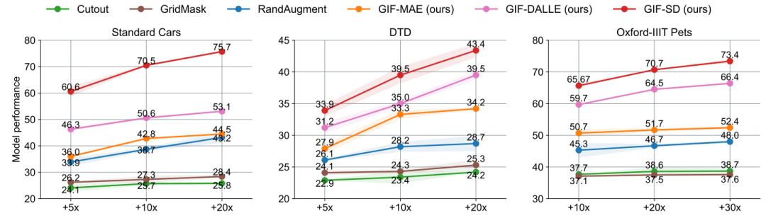 扩增效率 GIF 具有更强的扩增有效率:在 Cars 和 DTD 数据集上,使用 GIF-SD 进行 5 倍扩增的效果甚至超过了使用随机数据增强进行 20 倍扩增的效果。