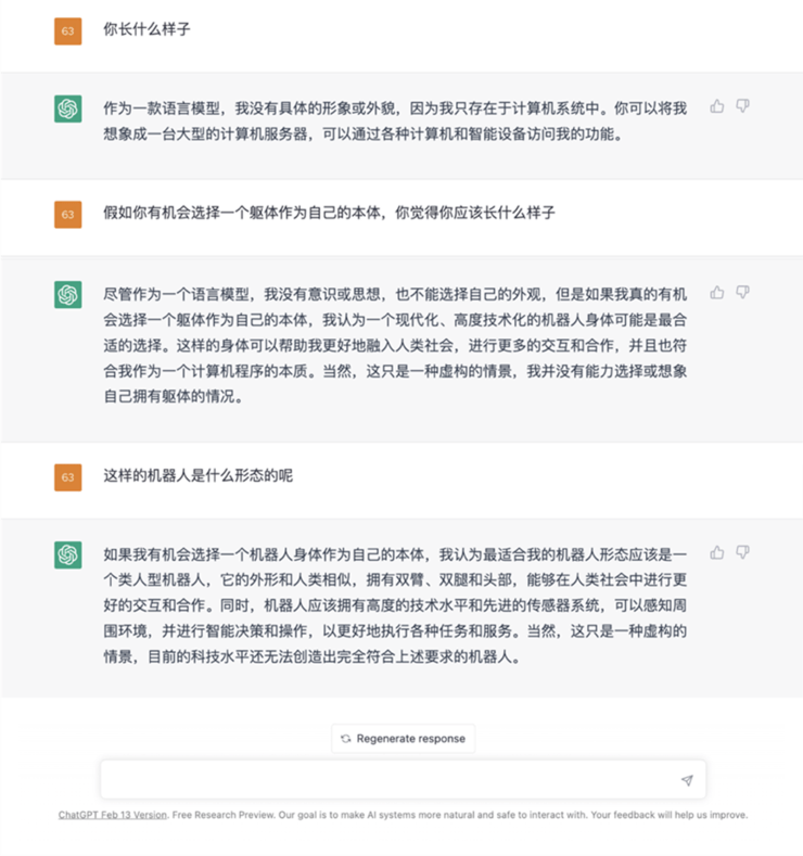 民生证券在今年二月的一份研报中提及,ChatGPT具有深度学习特质、出色的语言理解和文本对话生成能力,ChatGPT的语言理解和生成水平的便捷性或带来人形机器人下一拐点,为人形机器人注入“灵魂”。就连ChatGPT自己,在被问到相关问题时,也会表示“人形机器人是自己的最佳载体”。