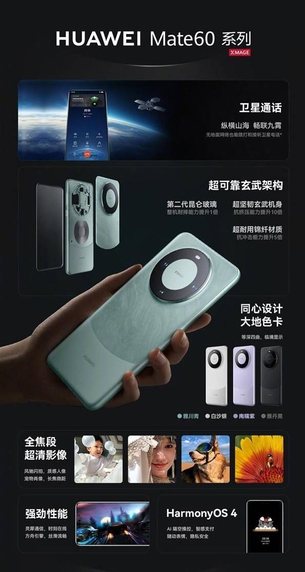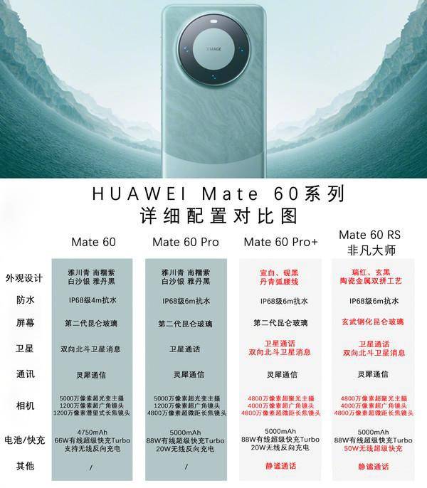 屏幕方面,该机采用分辨率为FHD+的2720×1260像素的6.82英寸OLED曲屏,同样采用第二代昆仑玻璃,其他参数基本与Mate60一样;影像方面,该机后置5000万像素超光变摄像头(F1.4~F4.0光圈,OIS光学防抖)+ 1200万像素超广角摄像头(F2.2光圈)+ 4800万像素超微距长焦摄像头(F3.0光圈,OIS光学防抖)三摄组合,前置1300万像素超广角自拍镜头;续航和快充方面,该机内置5000mAh电池,支持88W有线充电+50W无线快充+20W无线反向充电;其他方面,该机支持IP68级6m抗水、卫星通话以及更安全的3D人脸识别。整体来看华为Mate60 Pro的配置相比Mate60还是略胜一筹。
