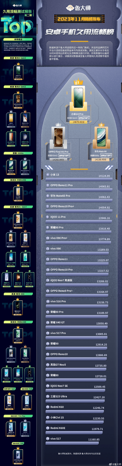 日前,@鲁大师 官博发布了11月份新机性能、流畅和久用流畅三大榜单,并称,“随着骁龙8 Gen3在小米14系列的首秀开始,11月注定会是骁龙8 Gen3终端刷屏的月份。同时,我们“久用流畅排行榜”的第二期也终于千呼万唤始出来,第二期的排行总的来说可以用“意料之外,情理之中”来概括。