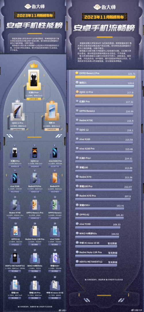 众所周知,在鲁大师发布的手机性能榜和流畅榜中,排名经常会大相径庭,当然,此次也不例外。根据其公布的11月新机发布安卓手机流畅榜公布的信息来看,Reno11系列可谓表现亮眼,Pro和标准版不仅名列前茅,还在总榜中取得了榜首和第五的好成绩。