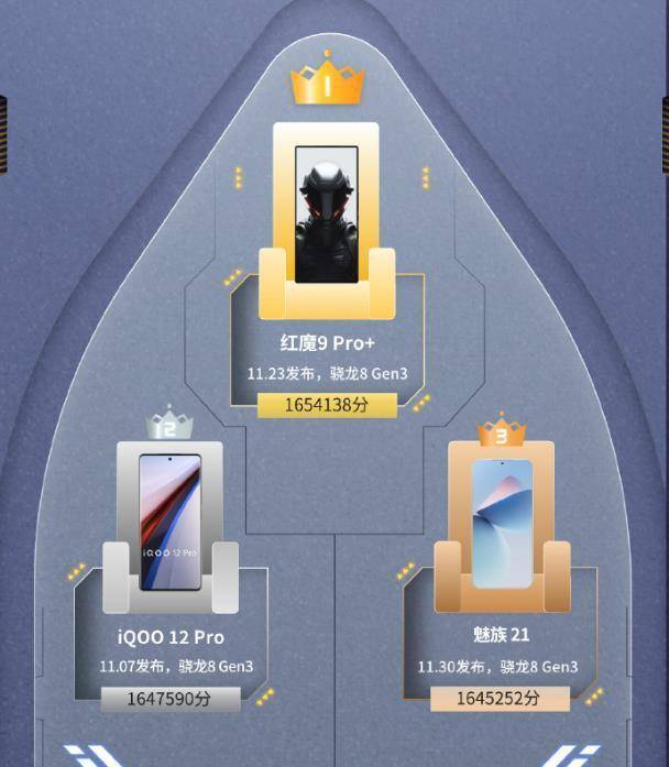 根据11月新机性能榜显示,排名前五的机型都搭载了高通骁龙8Gen3处理器,其中在当月发布的诸多旗舰机型中,红魔9 Pro+还是以卓越的性能表现如愿摘得榜首,分数达到了1654138分,紧随其后的分别是iQOO12 Pro和魅族21,这两款机型的得分分别为1647590分和1645252分,分列第二和第三位。而从分数来看,三款机型的得分最大差距也不到1000分,也就是说Top3的三款机型的性能差别不大。
