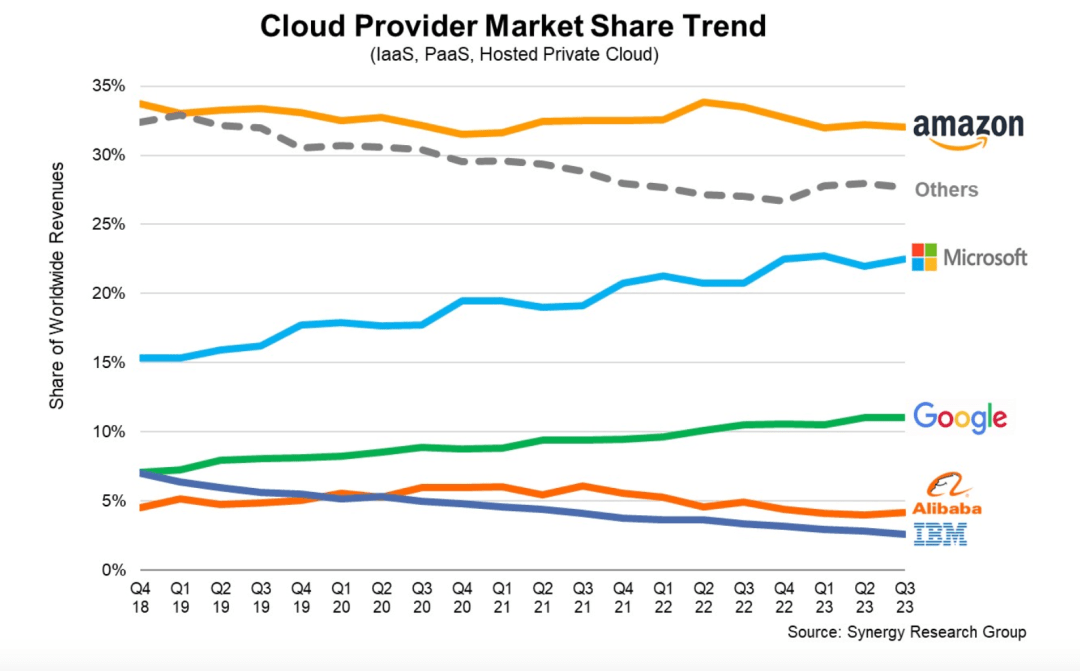 在云领域,竞争非常激烈。Synergy Research的最新市场数据显示,第三季度全球企业在云基础设施服务上的支出超过680亿美元,比去年第三季度增加了105亿美元,增长的动力是生成式人工智能技术和服务。AWS 占据托管云、基础设施即服务和平台即服务市场约 33% 的份额。