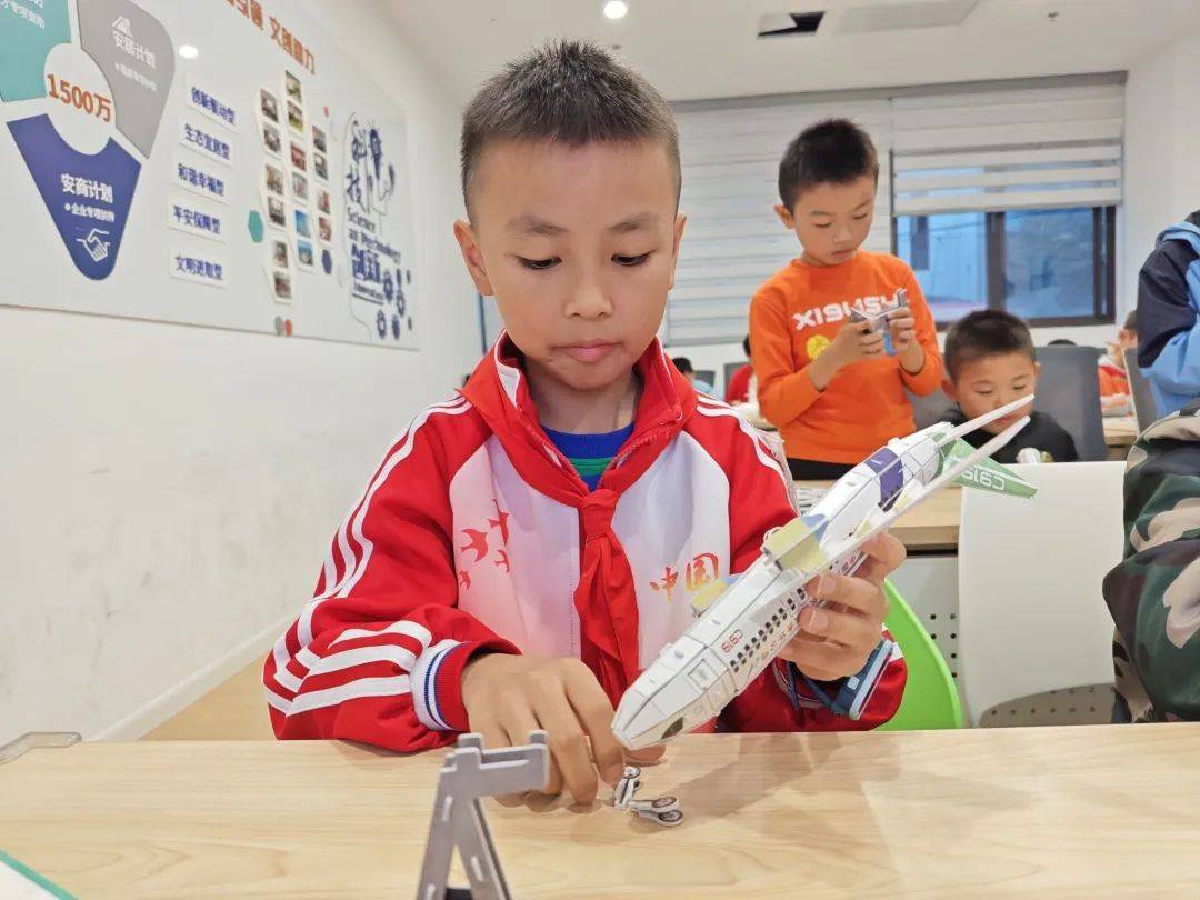 老师向孩子们介绍了C919国产大飞机的外形特征——四块挡风玻璃、超临界翼型、“蜂腰”尾以及“翼吊”的发动机。老师希望孩子们在之后的旅行中,注意观察C919国产大飞机与其他飞机的不同之处。在老师的指导下,孩子们兴致勃勃地对照拼装说明,一步一步进行拼装。拼装过程中,孩子们纷纷表示很有收获,对国产大飞机的认知也更深了。
