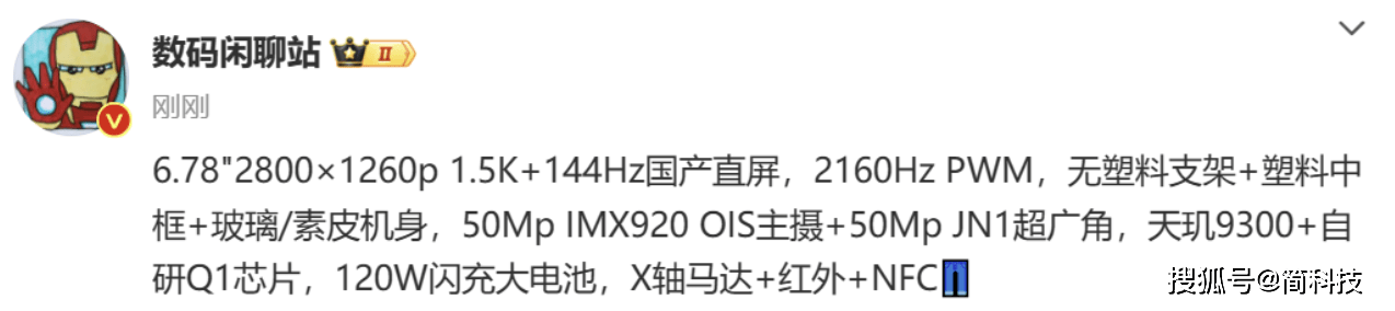 此前有博主爆料称,iQOO Neo9 屏幕大小为 6.78 英寸,国产京东方屏幕,2800*1260 分辨率(1.5K),支持 144Hz 刷新率、2160Hz 高频 PWM 调光,虽然取消了屏幕塑料支架,但塑料中框依旧保留,手机背面有玻璃和素皮两种材质,搭载天玑 9300 处理器+自研的 Q1 芯片,大电池+支持 120W 闪充、红外、NFC 等。