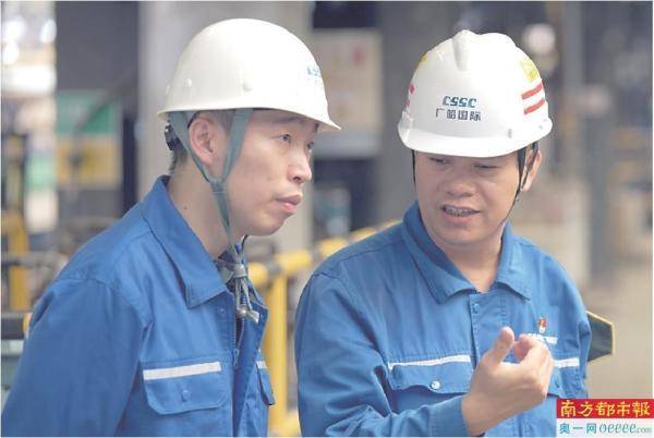 在偌大的船厂内,随处可见骑着自行车穿梭的工人们。他们身穿蓝色工衣,缓慢行驶在船厂中,这已然成为船厂员工的特色。黄汉城和广船国际宣传文化室主任符致冠也体验了一番他们的日常,一路骑行,在船坞前停下。