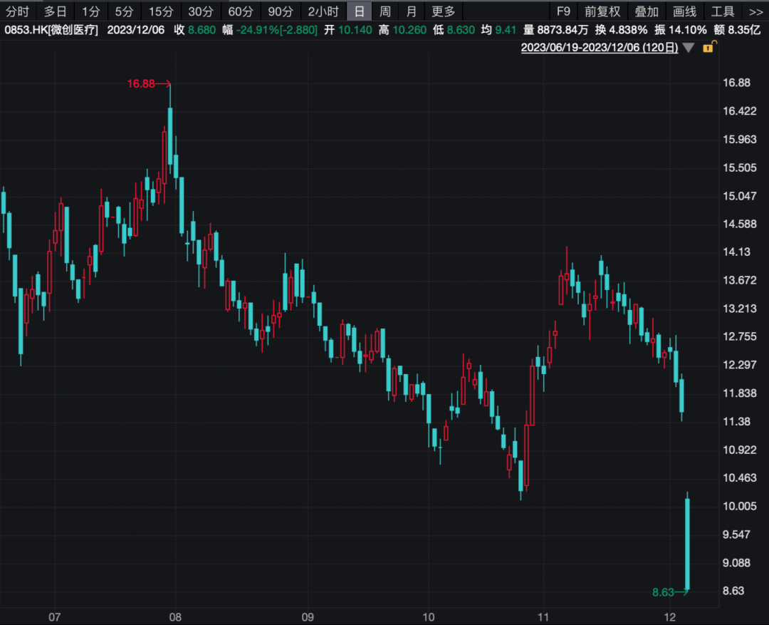 12月6日, 微创系大跌。微创医疗跌24%,微创机器人-B跌10%,微创脑科学跌超3%。消息面上,微创医疗宣布计划购回2026年到期零息可换股债券。公司表示,拟发行本金总额为2.2亿美元的债券,债券年利率5.75%,所得大部分净额将用于置换中期及长期境外债务。