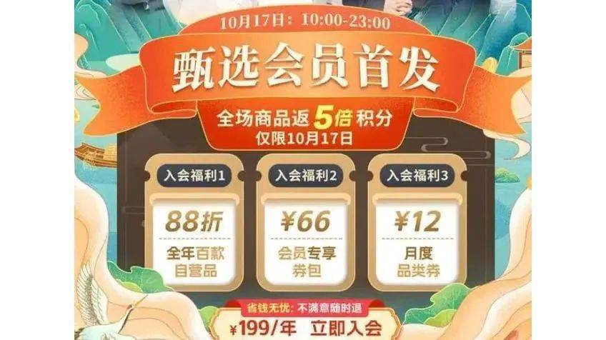 会费199元/年,权益包括百款自营品88折、一年12张(非自营)会员券、66元券包入会礼等。而且,为彰显诚意,一年没回本可退会费。