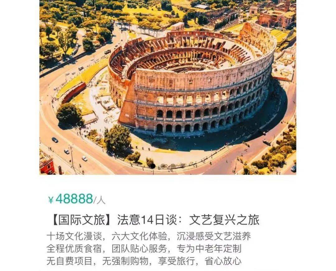 10月推出的欧洲文艺复兴旅行线路,面向55-65岁中老年人士,14天12晚,48888元/人。