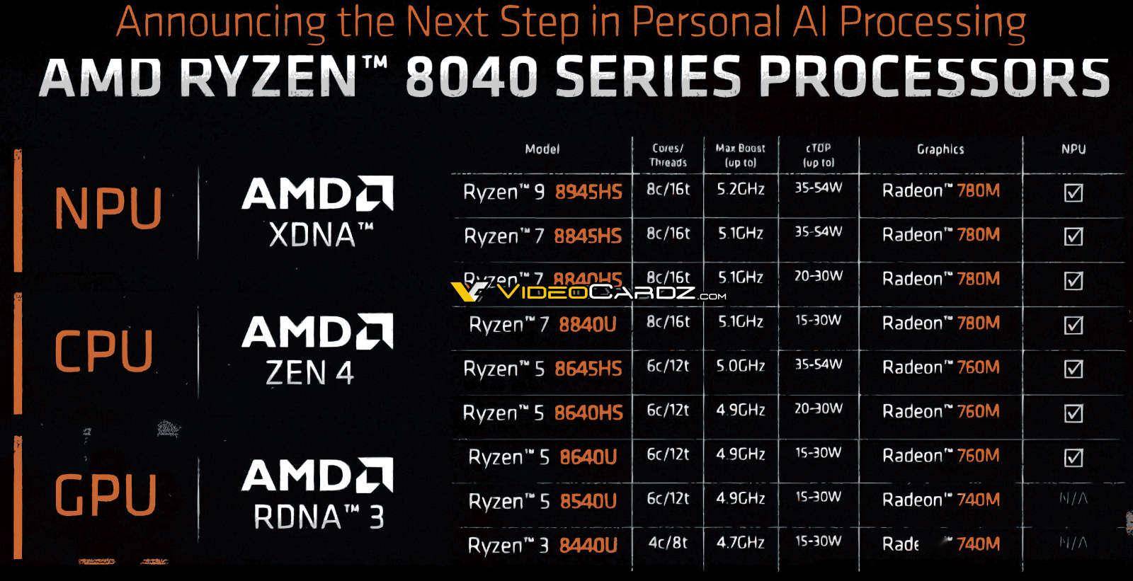 IT之家 12 月 6 日消息,AMD 锐龙 7040 系列处理器引入了 AI 引擎,算力最高可达 10 TOPS。据 VideoCardz 消息,AMD 即将在明日凌晨 2 点发布的锐龙 8040 系列将采用 XDNA NPU,AI 性能可达 16 TOPS。