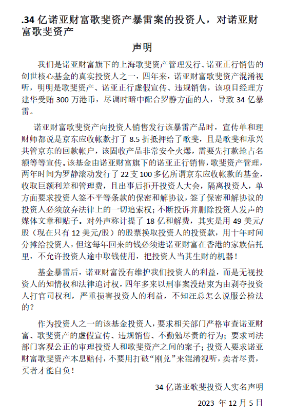 21世纪经济报道记者独家获悉,曾从诺亚财富旗下歌斐资产购买了底层资产为所谓“京东应收账款”基金产品的投资人,近期连发两份声明,联合签名的投资人多达105位,声明中,投资人质疑诺亚财富的尽调专业度,控诉诺亚与投资人的和解方案是“不平等条约”,要求诺亚方面赔付本息。