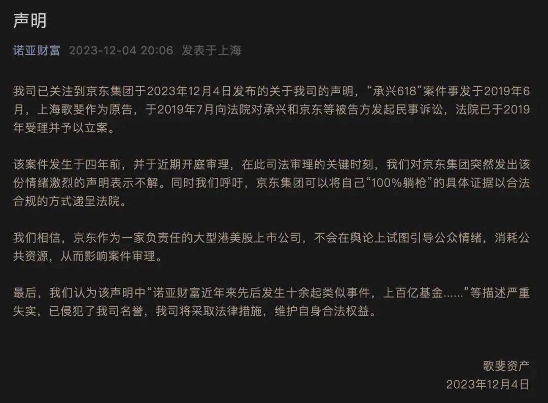 当日晚间,诺亚财富及歌斐资产对此做出回应,表示“承兴618”案件事发于2019年6月,上海歌斐作为原告,于2019年7月向法院对承兴和京东等被告方发起民事诉讼,法院已于2019年受理并予以立案。也就是说,该案件发生于四年前,近期开庭审理。