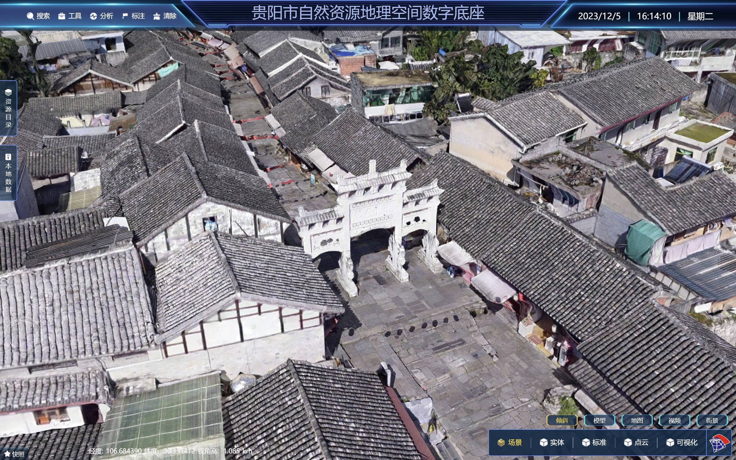 截至目前,贵阳贵安利用卫星遥感、航空摄影、倾斜摄影等技术手段,先后完成覆盖全域8525平方千米的高清影像底图、3005平方千米地形级实景三维、覆盖贵阳市主城区约400平方千米的城市级实景三维、部分建成区约94.15万栋的建筑物白模和1100多个720度全景数据,初步搭建了贵阳贵安地理信息数字空间底座,实现了从“抽象”到“真实”,从“平面”到“立体”,从“静态”到“时序”的地上地下、室内室外的全空间实景三维数据管理与统计分析,为自然资源要素和测绘地理基础信息提供高精度的三维可视化呈现。