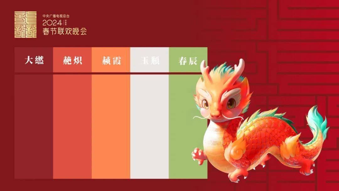 “龙辰辰”的配色选取了大繎、赩炽、赪霞、玉頩、春辰等中国传统色。“赪霞拂朝,苍烟懵夕”,赪霞色代表了红色的云霞,代表了旭日初升时霞光万丈的青春色彩。春辰是冰雪初融,草木萌动的颜色,它所属的青绿色系正是东方青龙的代表色。青龙是中国古代天文四象之一,代表着春天、希望和生长,也赋予了“龙辰辰”冬去春来、辞旧迎新的蓬勃生机。