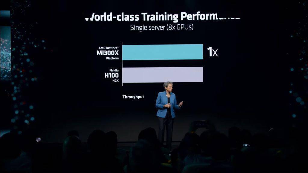 AMD 提到,在训练性能方面,MI300X 与竞争对手(H100)不相上下,并提供具有竞争力的价格 / 性能,同时在推理工作负载方面表现更为出色。