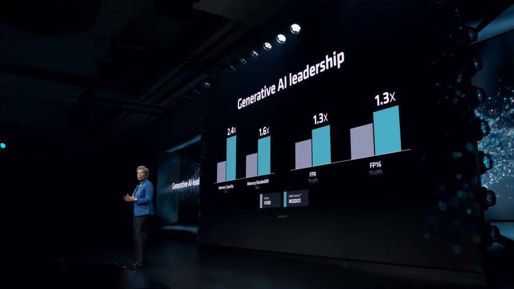 AMD 公司在演讲过程中,对比英伟达的 H100 加速卡,分享了 MI300X 的性能参数情况,IT之家附上数值如下: