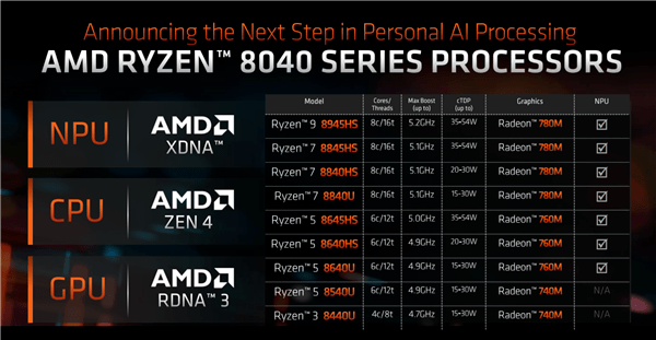 锐龙7 8840HS、锐龙5 8640HS分别对应现在的锐龙7 7840HS、锐龙5 7640HS,热设计功耗范围从35-54W收缩到20-30W。