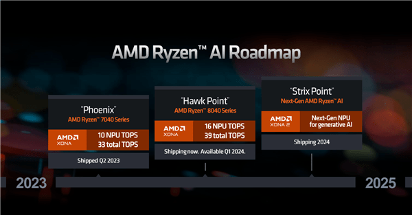 更激动人心的则要等到再下一代的“Strix Point” ,2024年内登场,将会升级到XDNA 2架构的新一代NPU,号称生成式AI性能猛增超过3倍。