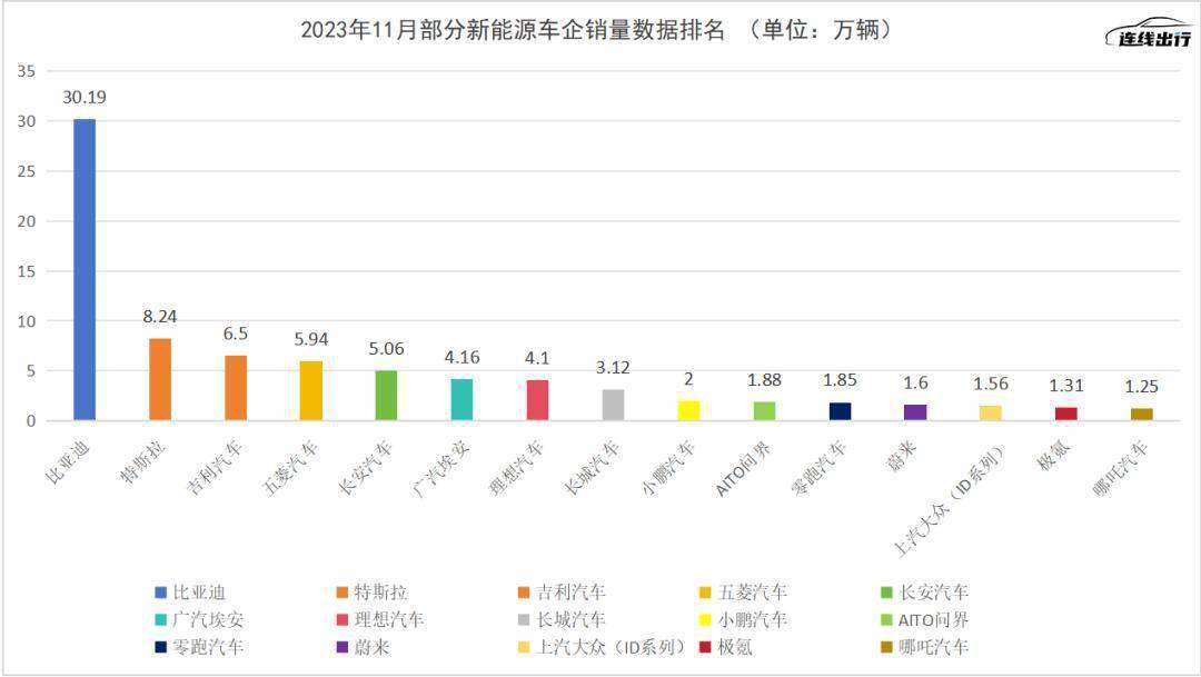 2023年11月部分新能源车企销量数据排名,数据来源于乘联会,连线出行制图