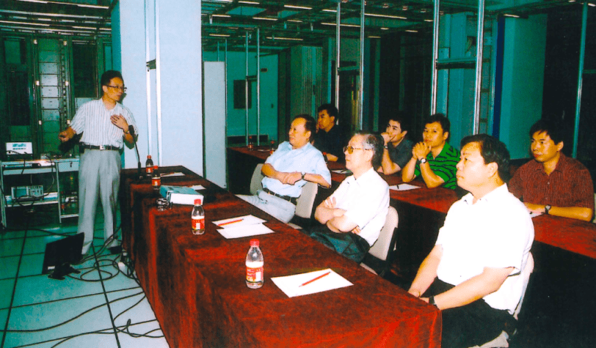 2005年北京,郭光灿(左一)给周光召(前排居中者)等讲解北京到天津光纤量子密码实验。