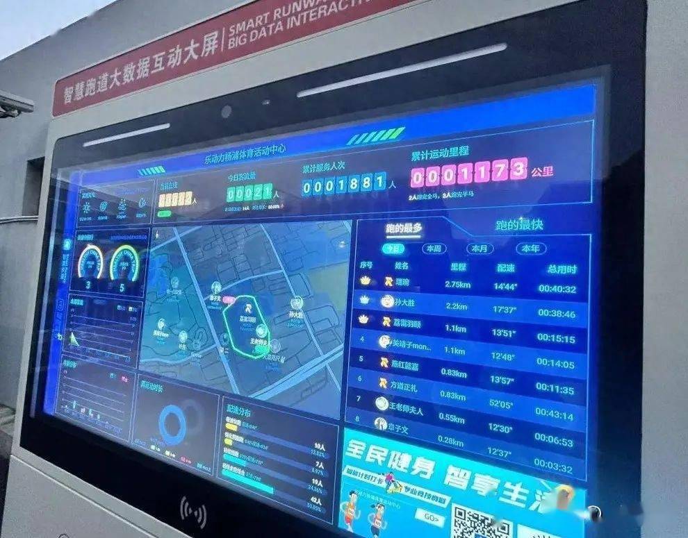 原来,这是一块AI智慧互动大屏,通过扫码登录之后,市民可以同时在手机和互动大屏幕上查看实时更新的日、周、月运动数据与“PK排行榜”。实时动态中,不仅可以显示个人在此次运动中消耗热量、能量代谢、运动里程、运动时长以及运动排名等信息,还能看到步道上市民们的运动方式统计图、客流量、运动总时长、男女比例人数饼状图、当前用户数、人均运动次数等大数据分析,也有时间、天气、PM值、步道缩略图等跑者们关心的数据。