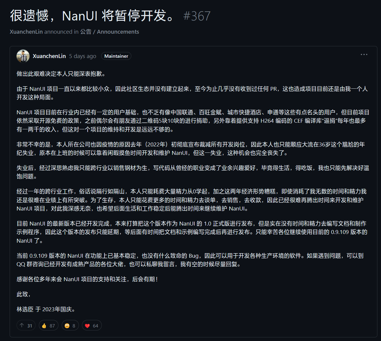 该项目的作者林选臣日前在 GitHub 上发布了停更公告,称因去年被裁员失业,他目前已经转行销售钢材,难以腾出时间进行 NanUI 界面组件的开发维护。