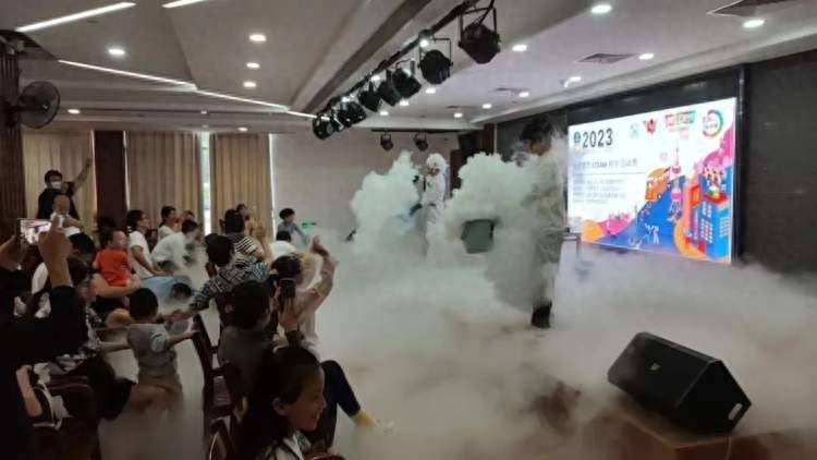 消失的水、神奇的布条、干冰泡泡澡、空气神棍、悬浮气球……一个个精彩的节目陆续呈现。表演者们将科学知识与节目、小游戏相结合,在场的孩子全被吸引了,积极地参与到互动当中。
