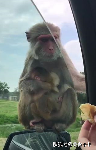 这时车主也拿起一块面包,打开车窗给猴子递了出去,这只猴子马上伸出手拿下,然后放进嘴里,看样子好像饿了好久一样。不过令人惊讶的是,母猴子拿到了食物并没有递给自己的孩子,反而自己吃了,这种行为也引起了大家的注意。有的人认为猴宝宝还小,现在只能喝奶,有的人认为母猴子比较自私,只想着自己,你认为这只猴子的行为到底是好是坏呢?