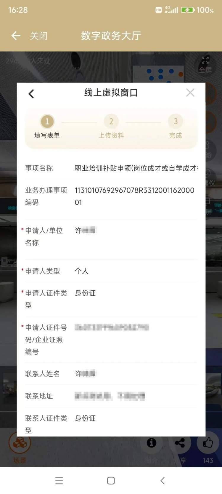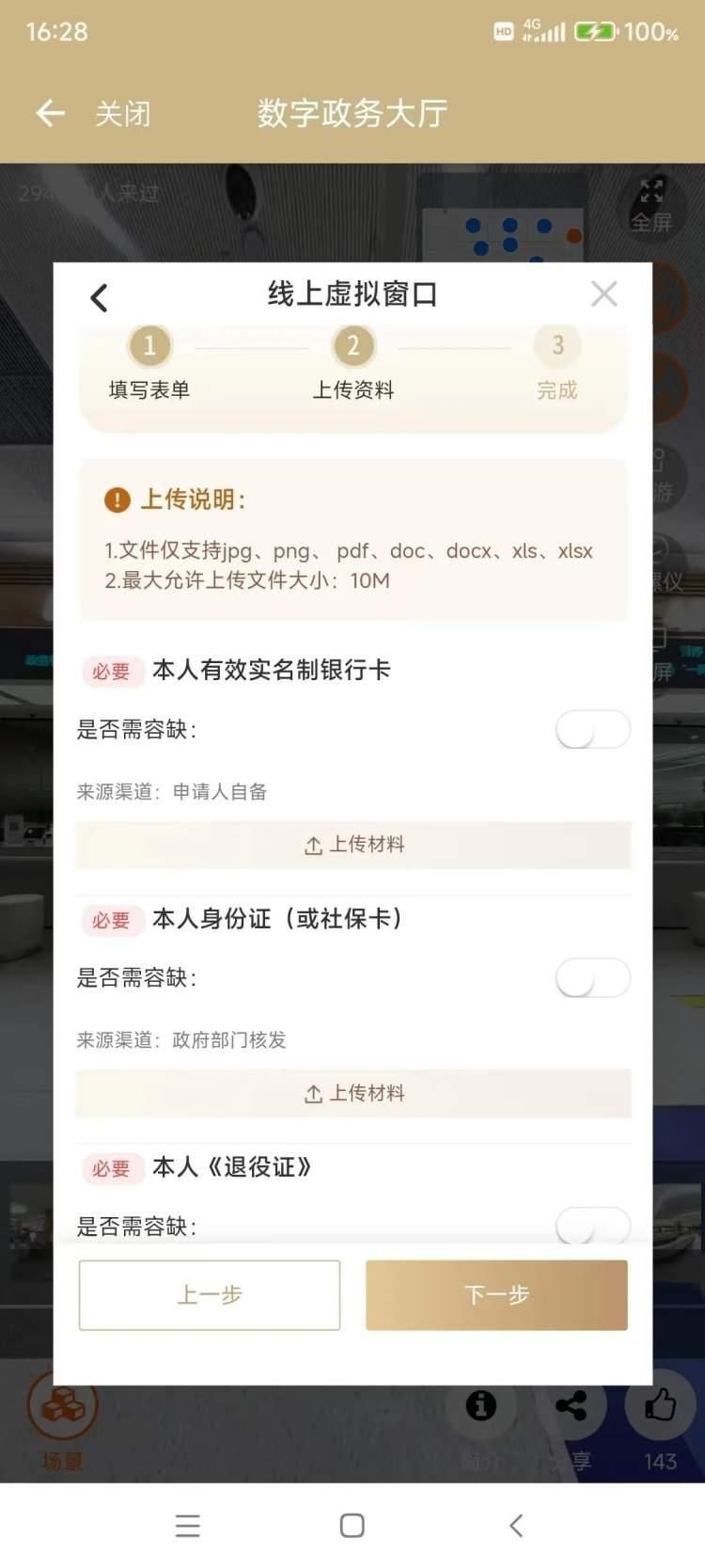 5.申报信息填写完成后,即可进行材料上传。上传材料过程中,如是在“两个免于提交”清单范围内的材料,点击右侧“调证”按钮,确认好个人信息后,系统弹出“授权提示”,通过授权确认后可以直接共享调用电子证照,实现材料免交。