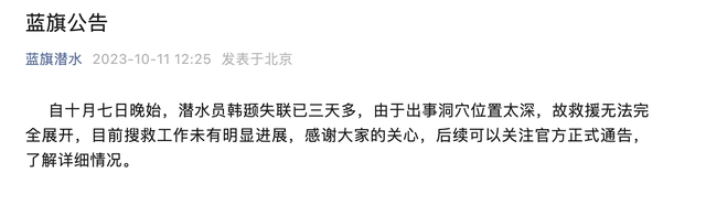 10月11日中午,蓝旗国际潜水俱乐部发布公告:自十月七日晚始,潜水员韩颋失联已三天多,由于出事洞穴位置太深,故救援无法完全展开,目前搜救工作未有明显进展,感谢大家的关心,后续可以关注官方正式通告,了解详细情况。