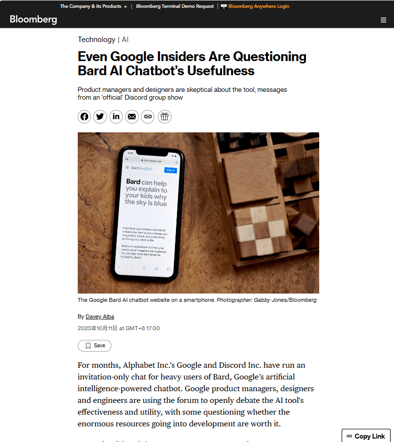 IT之家 10 月 12 日消息,据彭博社昨晚报道,谷歌和 Discord 共同邀请自家 AI 聊天机器人 Bard 的忠实用户,设立一个聊天室。其中,Bard 的产品经理、设计师和工程师在聊天室内讨论了 AI 的有效性和实用性,但也有一些人开始提出质疑。