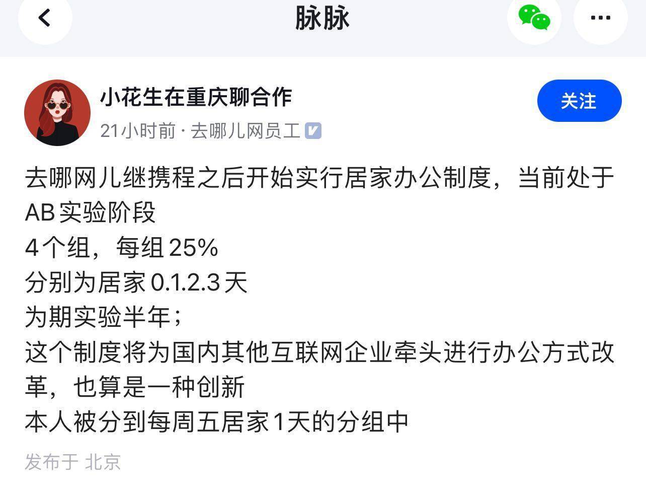 原标题:去哪儿网试行居家办公制度,半年时间验证可行性