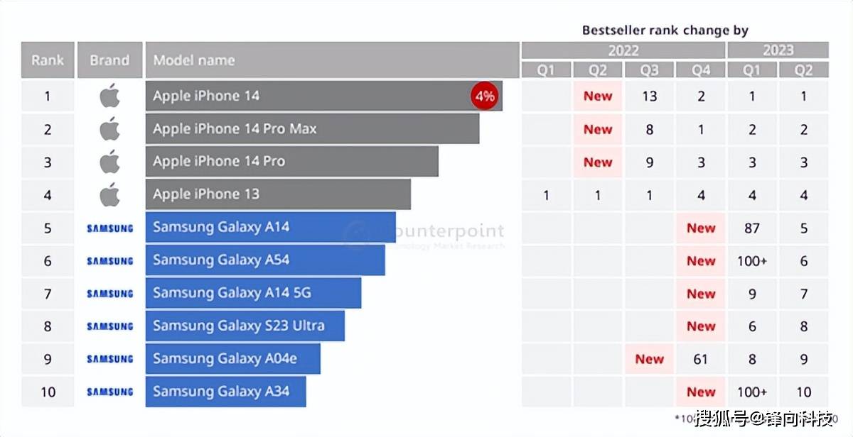 Counterpoint报告称之所以出现这种情况主要是由于iPhone的吸引力越来越大,其中iPhone 13与iPhone 14在北美市场、欧洲市场同比销量都是增长的,而iPhone 13 Pro系列与iPhone 14 Pro系列同比在亚洲市场与欧洲市场份额大幅度增加。这就导致了在全球单品销量前十之中苹果霸占前四的情况。
