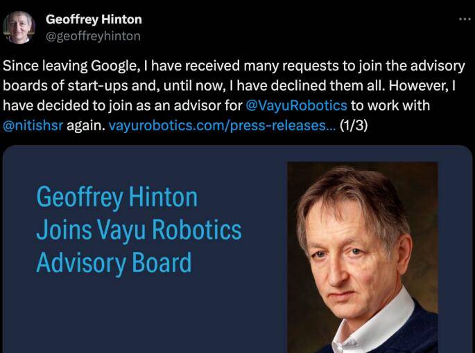 🤖 Geoffrey Hinton重返机器人领域,成为Vayu Robotics顾问。