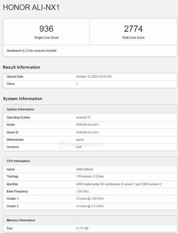手机中国获悉,即将推出的荣耀X9B此前已经在TDRA和IMDA认证网站上被发现。TDRA确认了X9B的型号名,现在,荣耀X9B又出现在了Geekbench跑分网站上。相关信息显示,荣耀X9B将采用骁龙6 Gen1移动平台,并配备12GB的运存,单核和多核测试分别取得了936分和2774分的成绩。在软件方面,这款手机将运行Android 13系统。