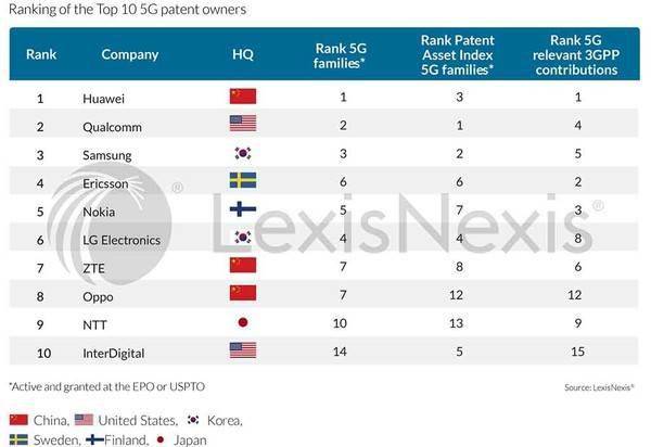 华为、爱立信和诺基亚被认为是5G标准的最大贡献者。苹果公司在专利资产指数(Patent Asset Index)中进入前10名,稳居前11-20名。