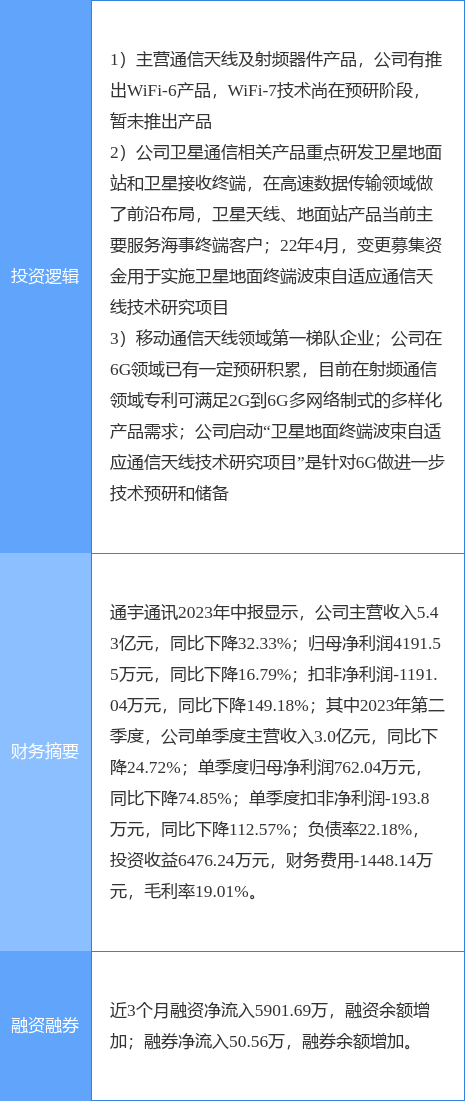 通宇通讯涨停收盘,收盘价20.61元。该股于9点56分涨停,2次打开涨停,截止收盘封单资金为8235.7万元,占其流通市值1.67%。