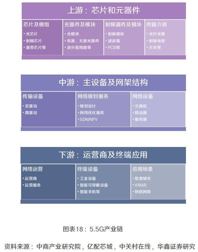 5.5G产业链上游环节包括,芯片和元器件领域,如射频芯片、有源和无源光器件、滤波器和射频电缆等;中游环节主要涉及到主设备及网架结构,包括微基站、网络优化服务和路由器等,下游环节则涉及到运营商及终端应用。