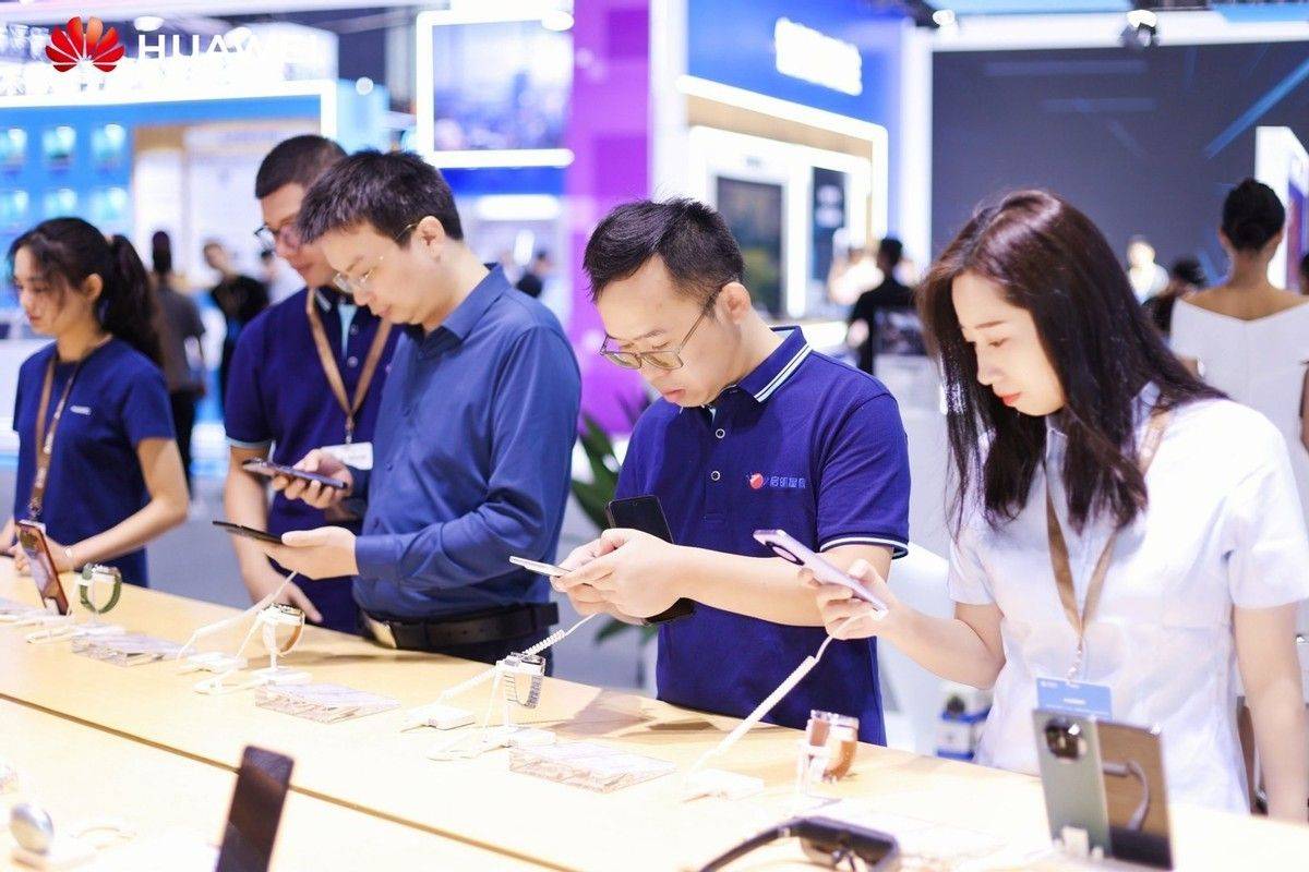 在1+8陈列区,华为最新的旗舰手机、平板、笔记本等产品为参观者展示了华为终端强大的研发实力。特别是华为Mate60系列和Mate X5系列自上市以来热度不减,格外受欢迎,展台围满了观众都想亲自上手体验一下,最新款手机。