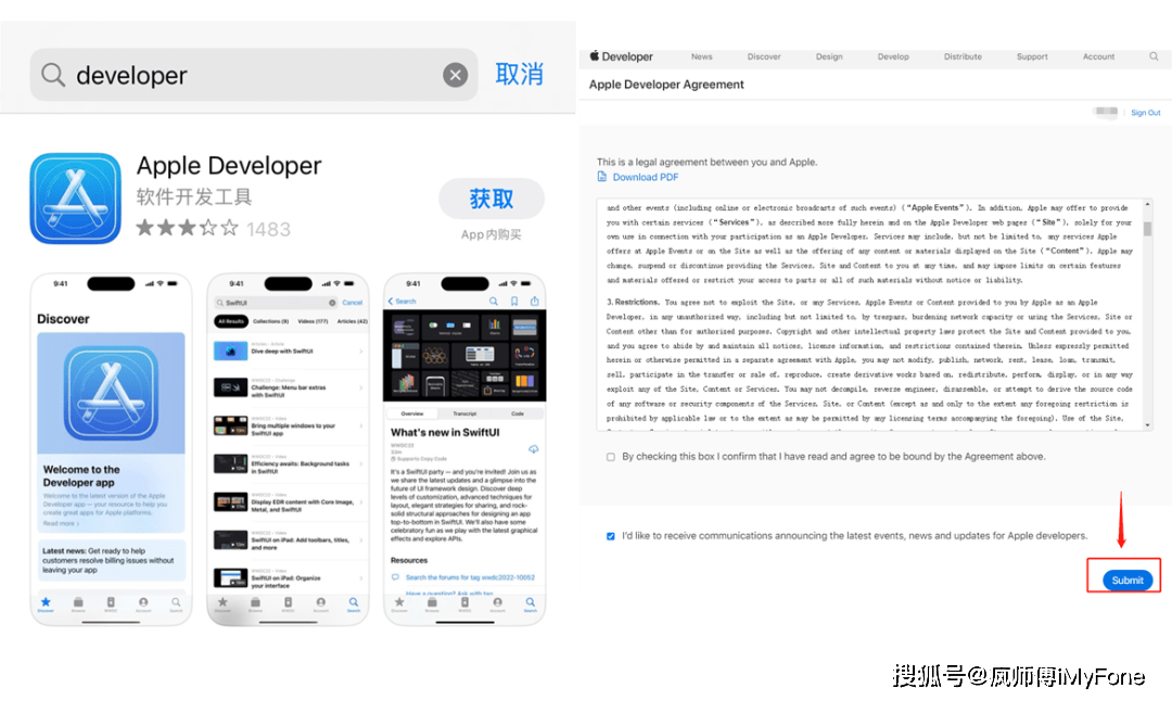 首先在App Store下载“Apple Developer”或者打开网页developer.apple.com,然后登录Apple ID(注意这里的ID只能用邮箱,如果没有就需要注册后再登录),登录之后勾选协议点击“submit”(这里只有网页端需要)。