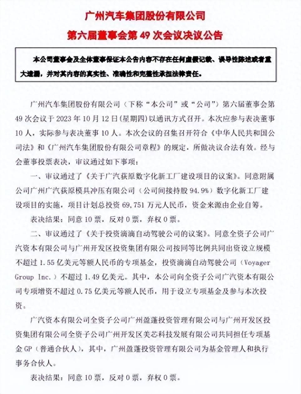 10月12日,广汽集团发布公告,董事会同意全资子公司广汽资本有限公司与广州开发区投资集团有限公司按同等比例共同出资设立规模不超过1.55亿美元等额人民币的专项基金,投资滴滴自动驾驶公司不超过1.49亿美元(约10.88亿元人民币)。