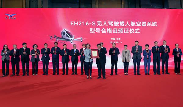 10月13日,EH216-S无人驾驶载人航空器系统型号合格证颁证仪式在北京民航国际会议中心隆重举行,中国民航局向亿航智能正式颁发EH216-S无人驾驶载人航空器系统型号合格证。