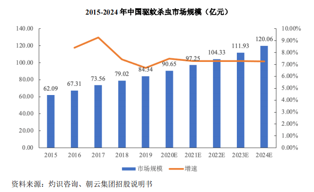 在驱蚊用品领域,作为日常消费品,驱蚊产品在我国有着巨大的容量基础,经过多年发展,我国驱蚊产业逐步完善。根据灼识咨询数据,我国驱蚊杀虫市场零售额由2015年的62.09亿元增长到2019年的84.34亿元,年复合增长率为7.96%,预计到2024年市场零售额将达到120.06亿元,2020-2024年年均复合增长率为7.28%。
