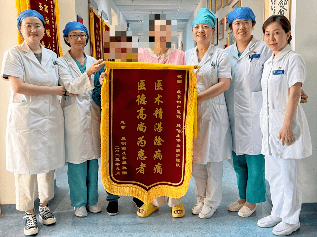 手术关平稳度过了,术后保胎治疗、胃肠功能恢复、腹部伤口愈合、抗贫血抗感染等等,真可谓“过五关、斩六将”。段教授时时刻刻关注患者一点一滴的病情变化及化验指标波动,不断调整诊疗方案。在大家的精心照料下,袁女士与腹中的宝宝平稳地度过了围术期。在病房的欢声笑语中,袁女士和母亲为段教授及其团队送上锦旗表达感激之情。