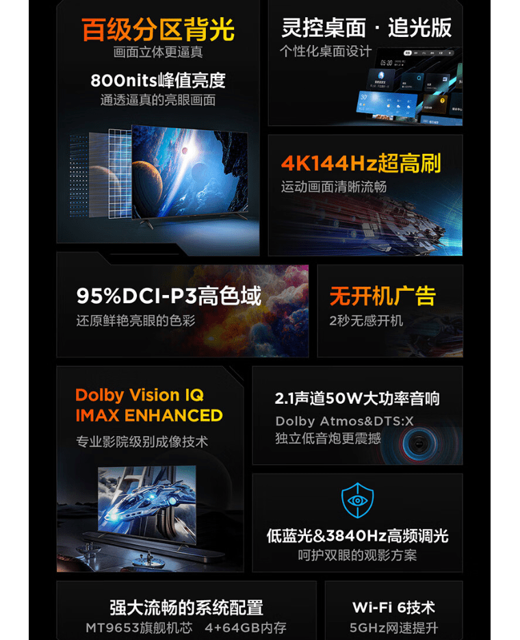 其明确标注4K 144Hz高刷,还是比很多用算法的电视更强大的,此外是240Hz MEMC,当然用处不是那么大。产品支持杜比视界IQ,支持IMAX ENHANCED,提供影院级感受。支持低蓝光护眼模式,采用3840Hz高频调光更为养眼。