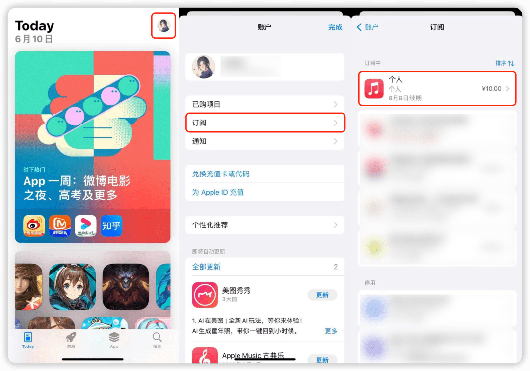 大家可以进入 App Store,点击右上角的头像,在「订阅」中找到 Apple Music 订阅。