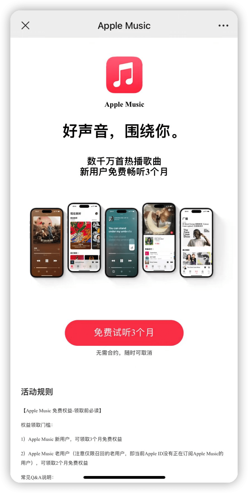 本次活动与之前基本一致,Apple Music 新用户可以免费领取 3 个月会员权益。